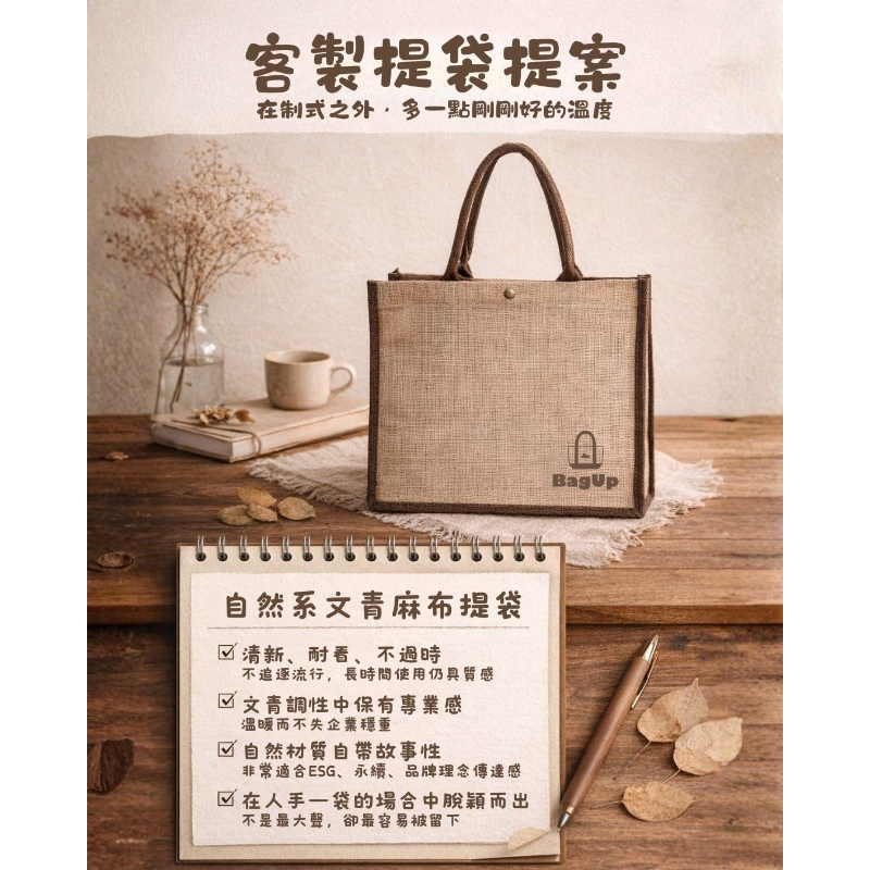 自然系麻布客製提袋 不張揚,卻讓品牌被記住 在人手一袋的活動裡,用溫暖的材質與清新的設計,讓企業形象,被留下,而不是被丟棄。